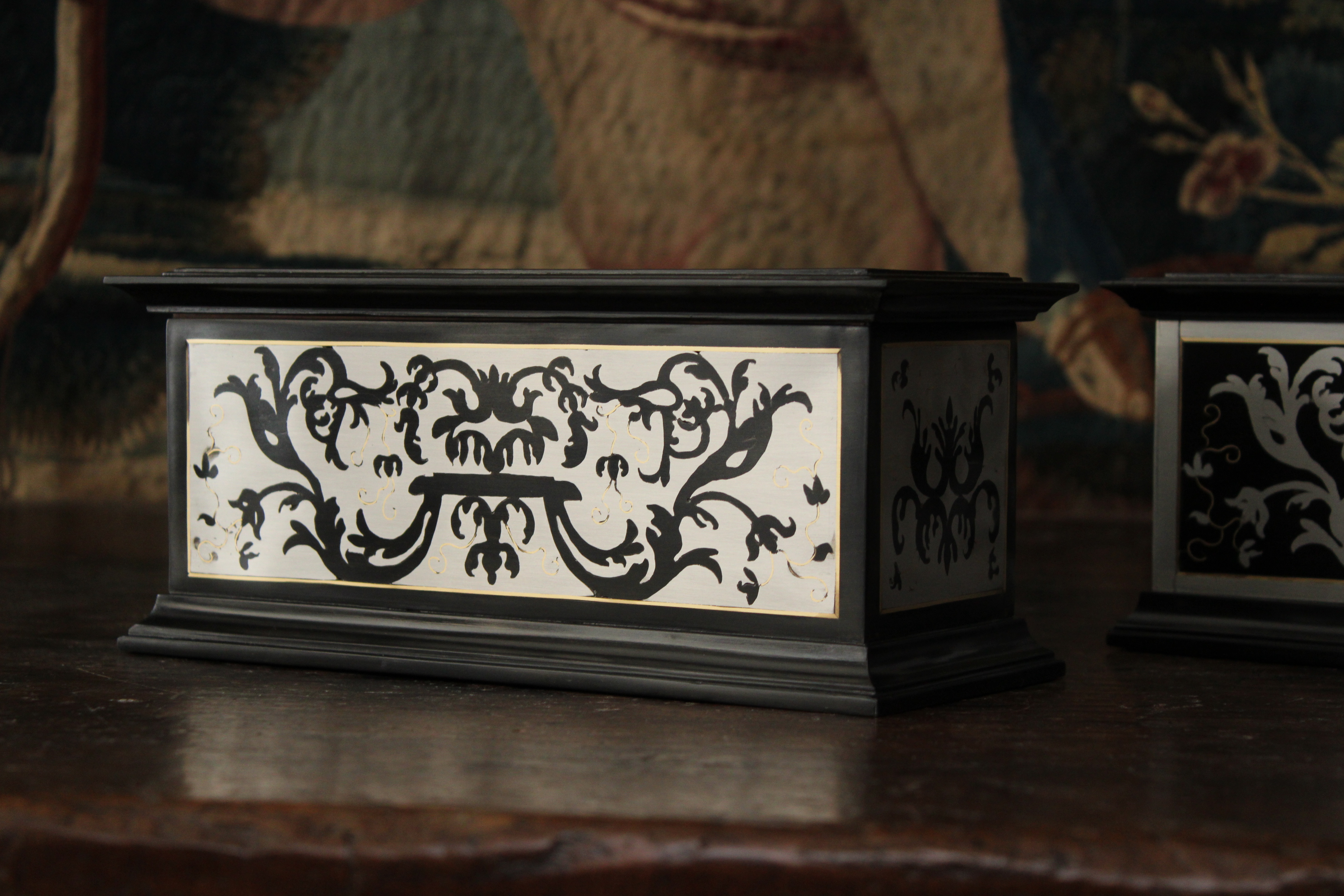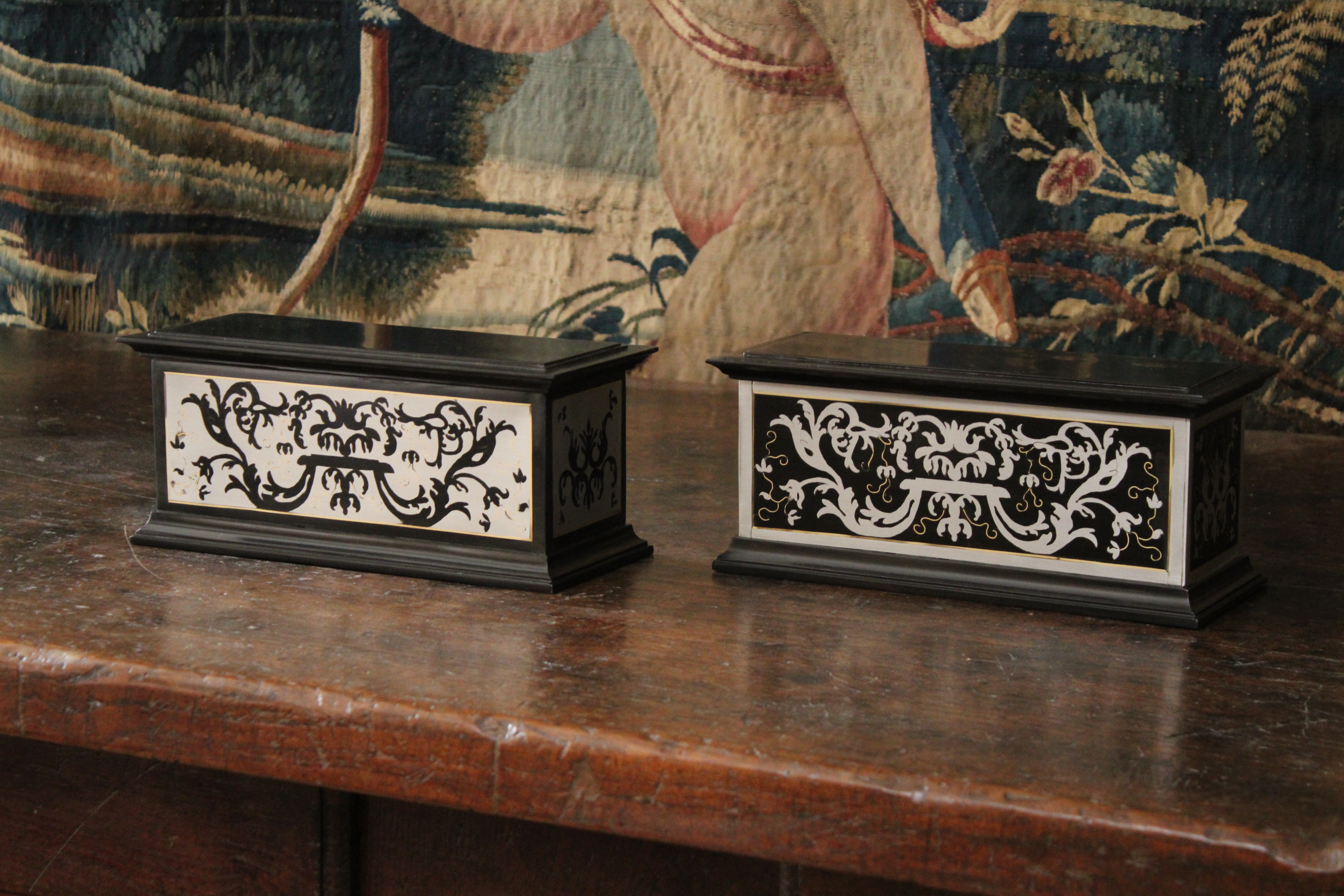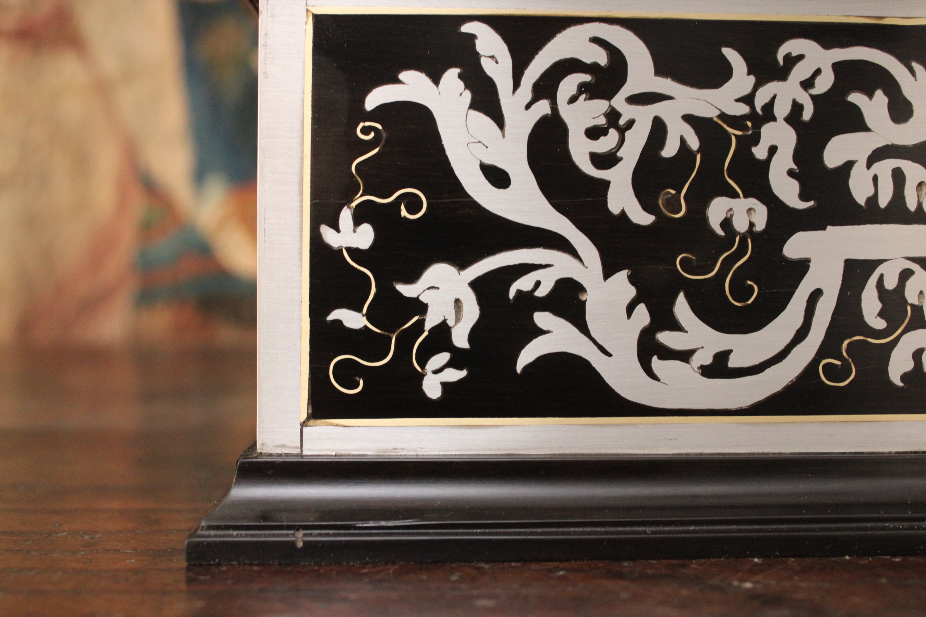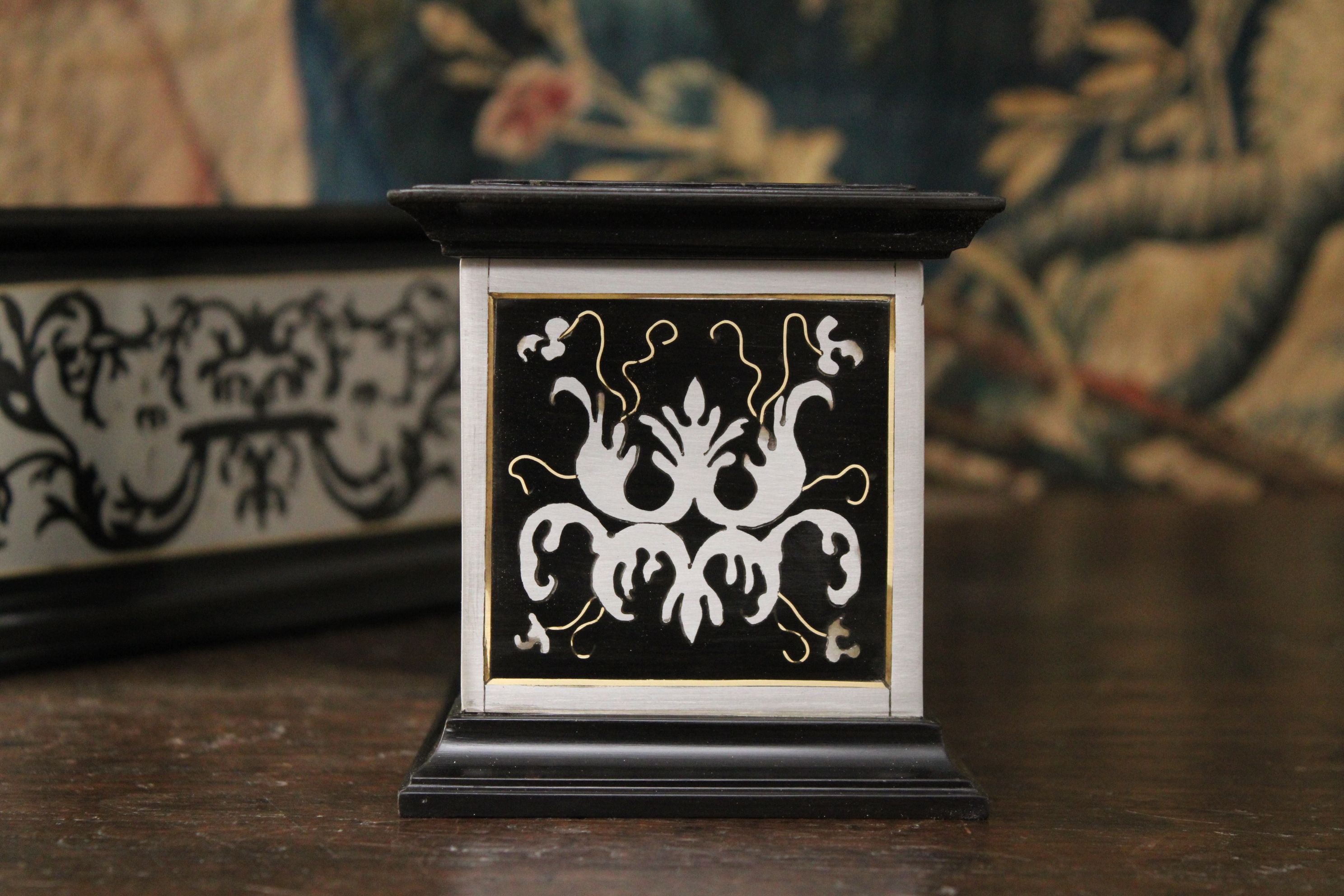 Création d’un socle orné de marqueteries Boulle en ébène et étain.
