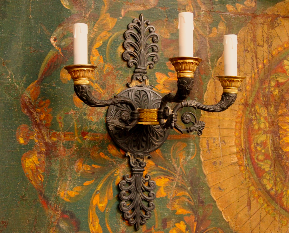 Suite de 3 appliques en bronze patiné et doré de style Empire, XXe siècle