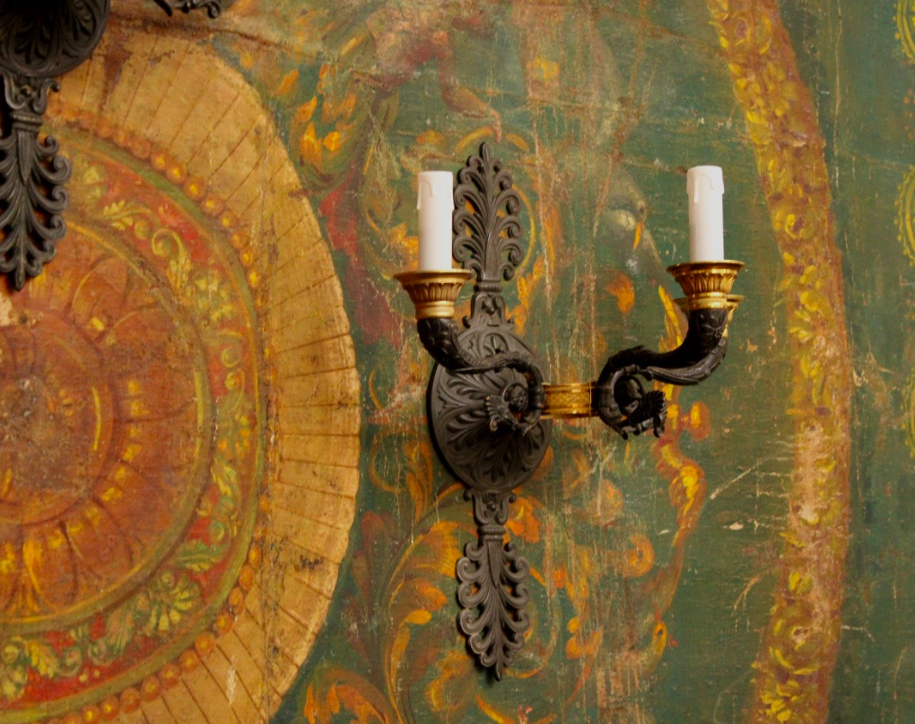 – Appliques à trois feux arborant un décor caractéristique du style Empire avec notamment un support en rosace à palmettes, des palmettes stylisées aux extrémités en volutes, une couronne en bronze doré ciselé à motifs géométriques servant de support à trois bras de lumière en corne d’abondance. Ces dernières sont sculptées d’élégants enroulement aux motifs végétaux. Les bobèches en bronze doré sont décorées d’une frise de feuilles de lotus alternées avec des boutons portés sur tige.