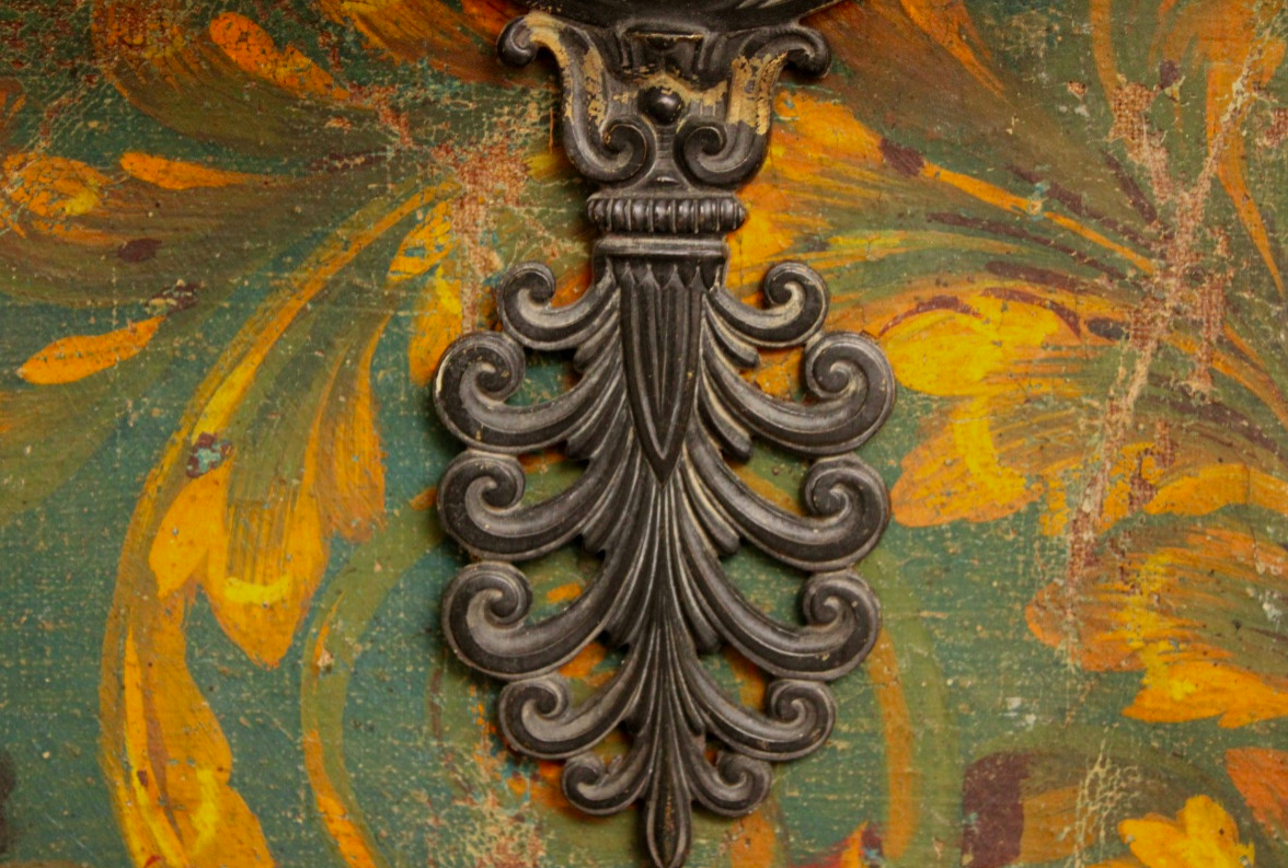– Ces appliques, attrayantes pour la suite de trois qu’elles constituent, se distinguent également par les recherches d’effets de matière qui les composent. On observe une variation dans les techniques de ciselure ; les surfaces polies des cercles de la couronnes apporte brillance et ressortent d’avantage par rapport aux surfaces amaties par des petits motifs de fleurettes délicatement ciselés au centre des losanges. Ajoutée la juxtaposition du bronze patiné aux éléments en bronze doré, ces appliques offrent d’aimables jeux de contrastes de couleur et de lumière.