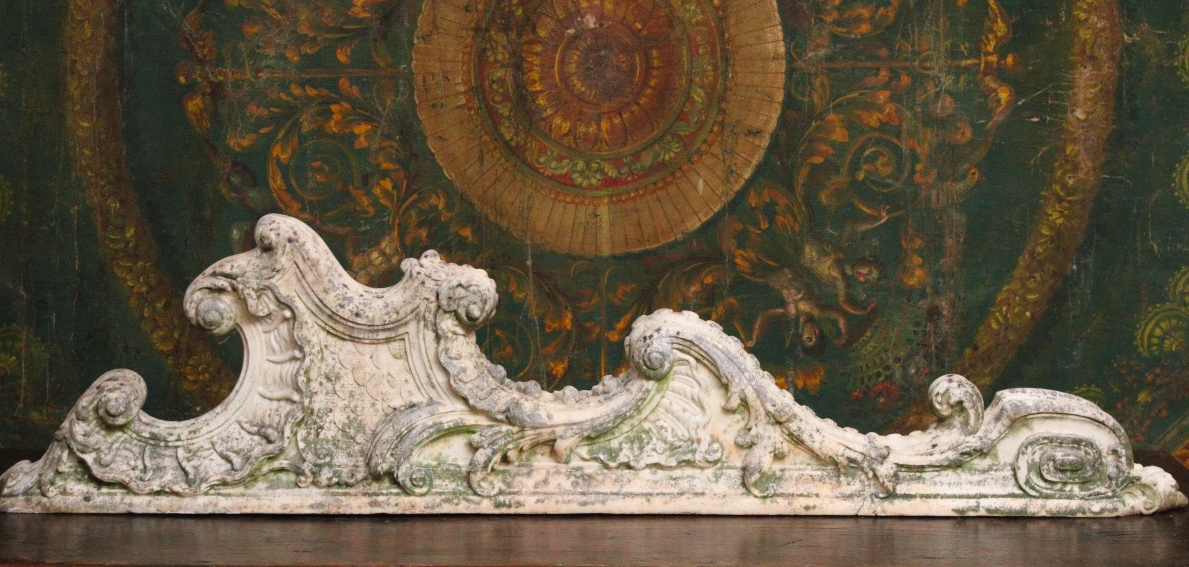 – Cet élément architectural imposant par sa taille présente un décor caractéristique du style Rocaille. La composition et les ornements sculptés en témoignent ; les formes sont fantaisistes mais d’inspiration naturaliste. On y retrouve l’évocation du monde animal marin avec des formes de coquillages, d’écailles, de tentacules de céphalopodes et du monde végétal avec des feuilles d’acanthes. Des ornements qui favorisant les courbes et contre-courbes très caractéristiques de ce style.