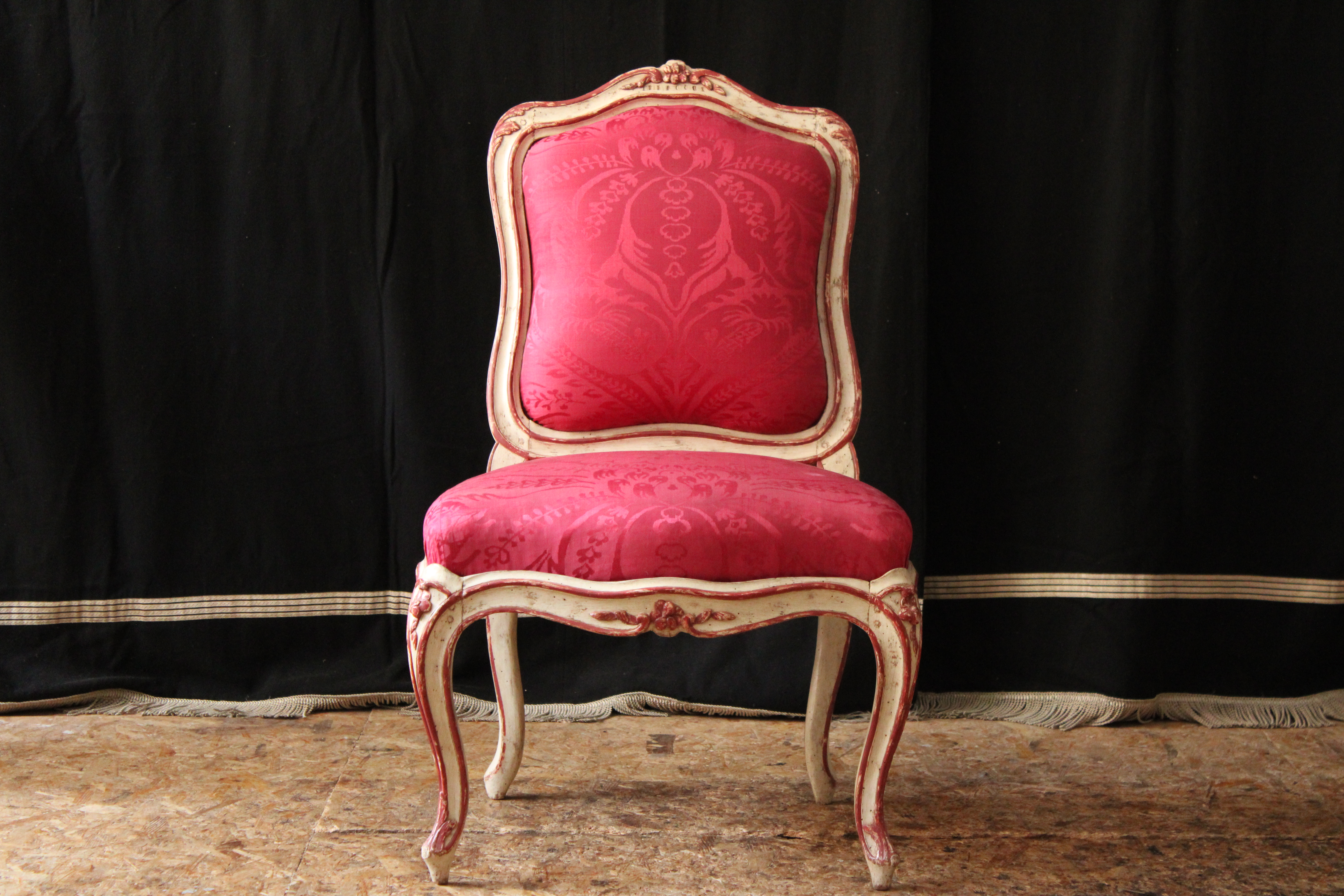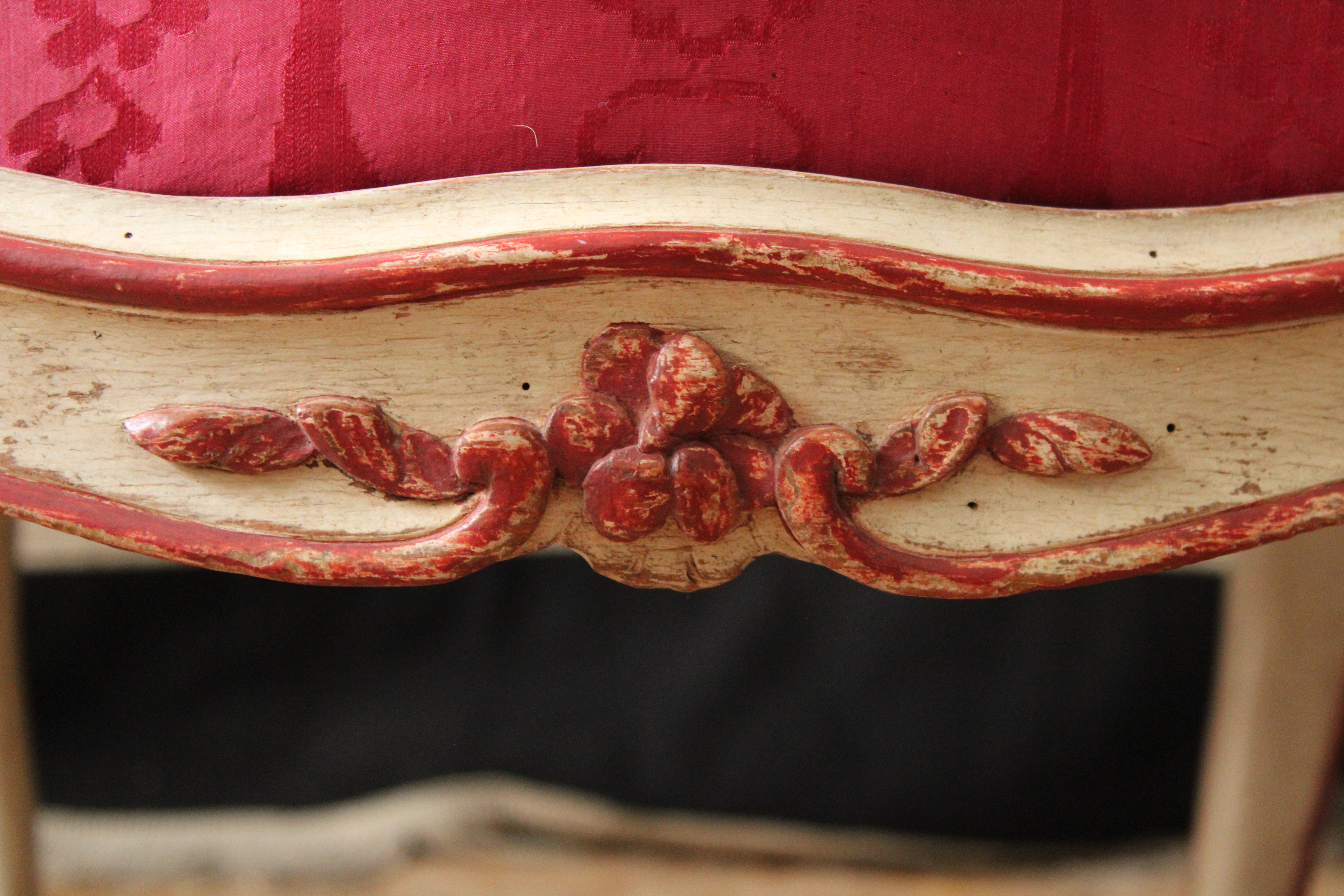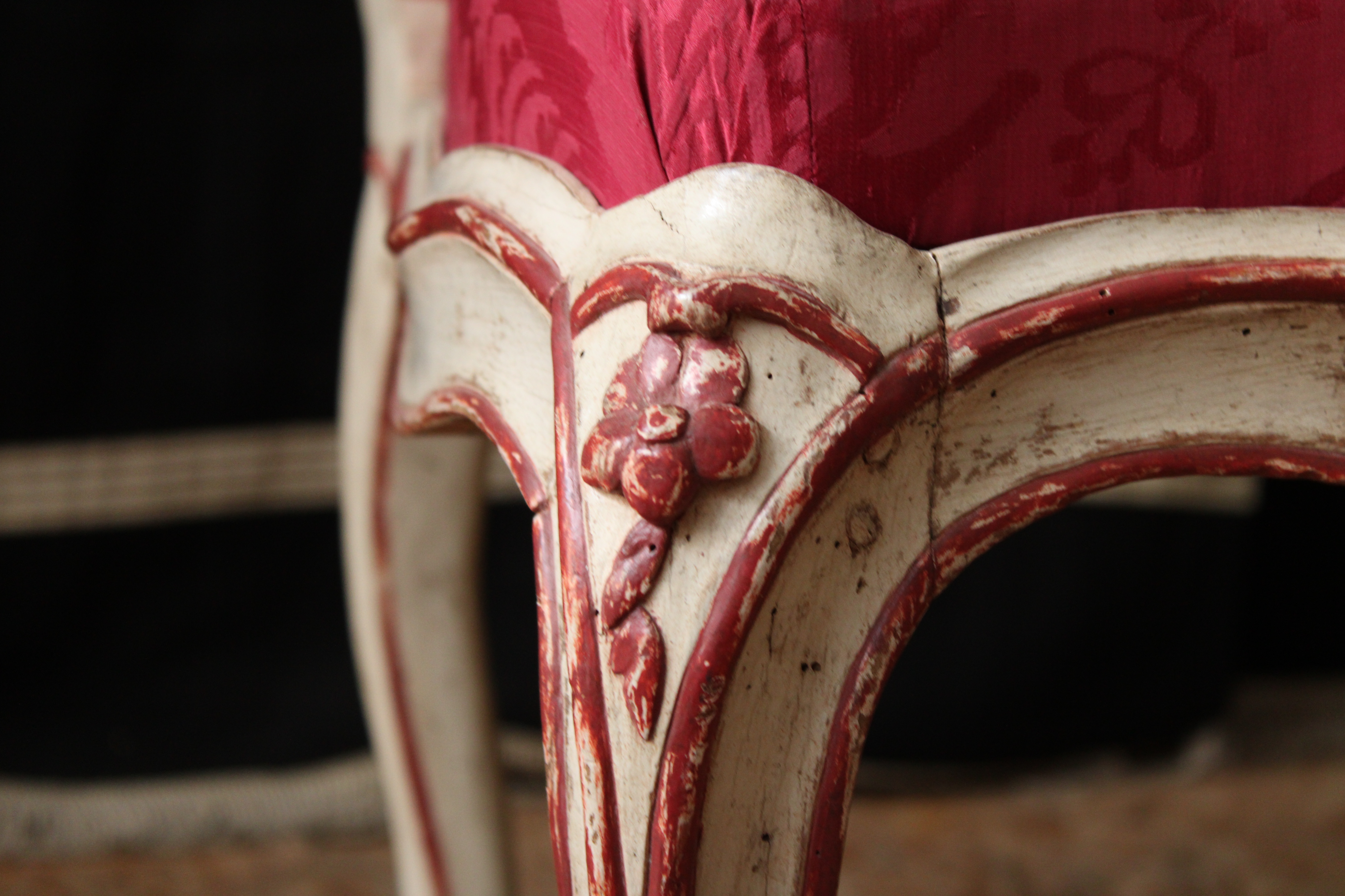 Chaise en hêtre sculpté , mouluré et laqué blanc rechampi rouge, le dossier et l’assise amovibles « à châssis » garnis d’un damas de soie cramoisie. Présentant des lignes discrètes et élégantes, finement sculptée de fleurs au naturel mises en valeur par le rechampi rouge.