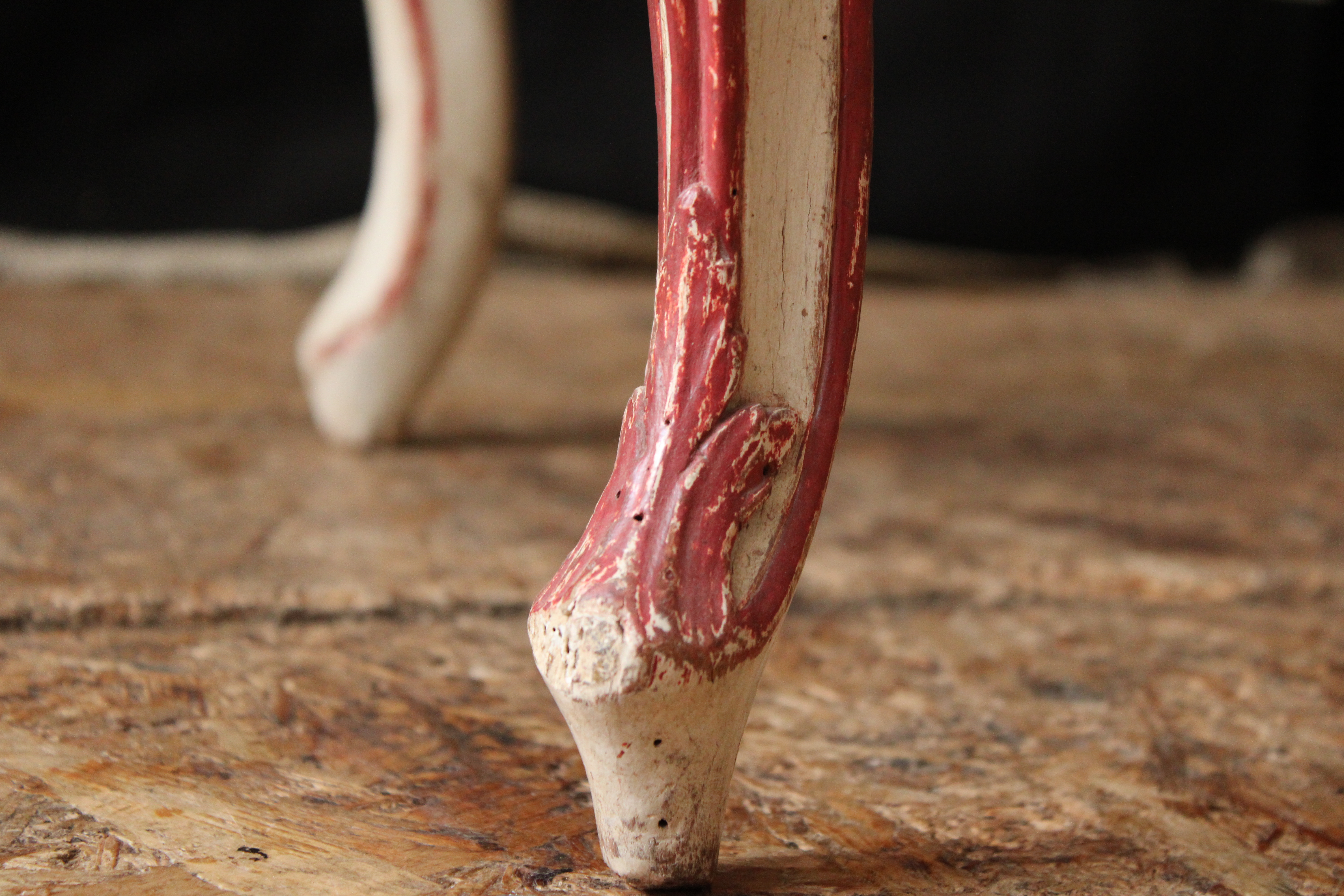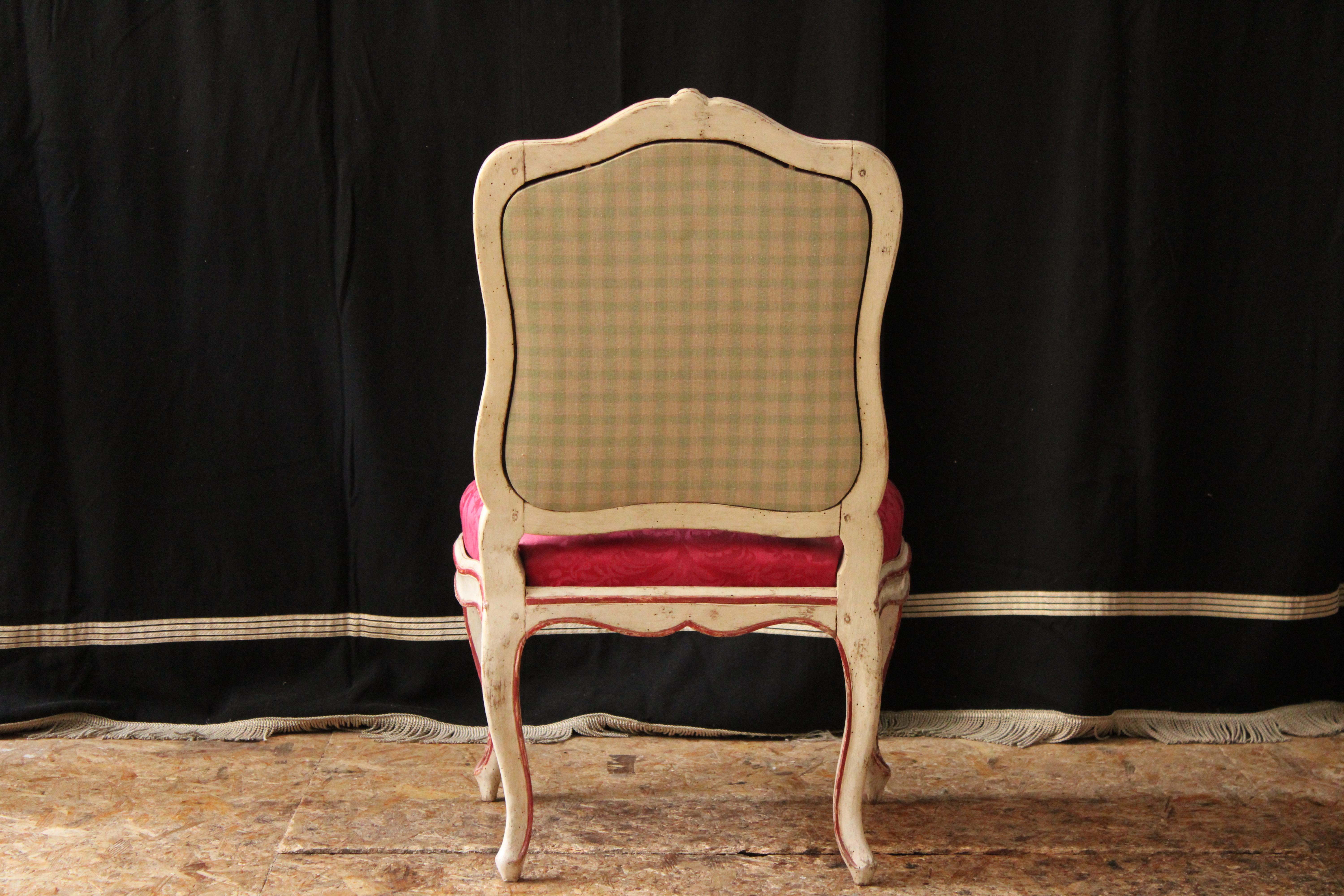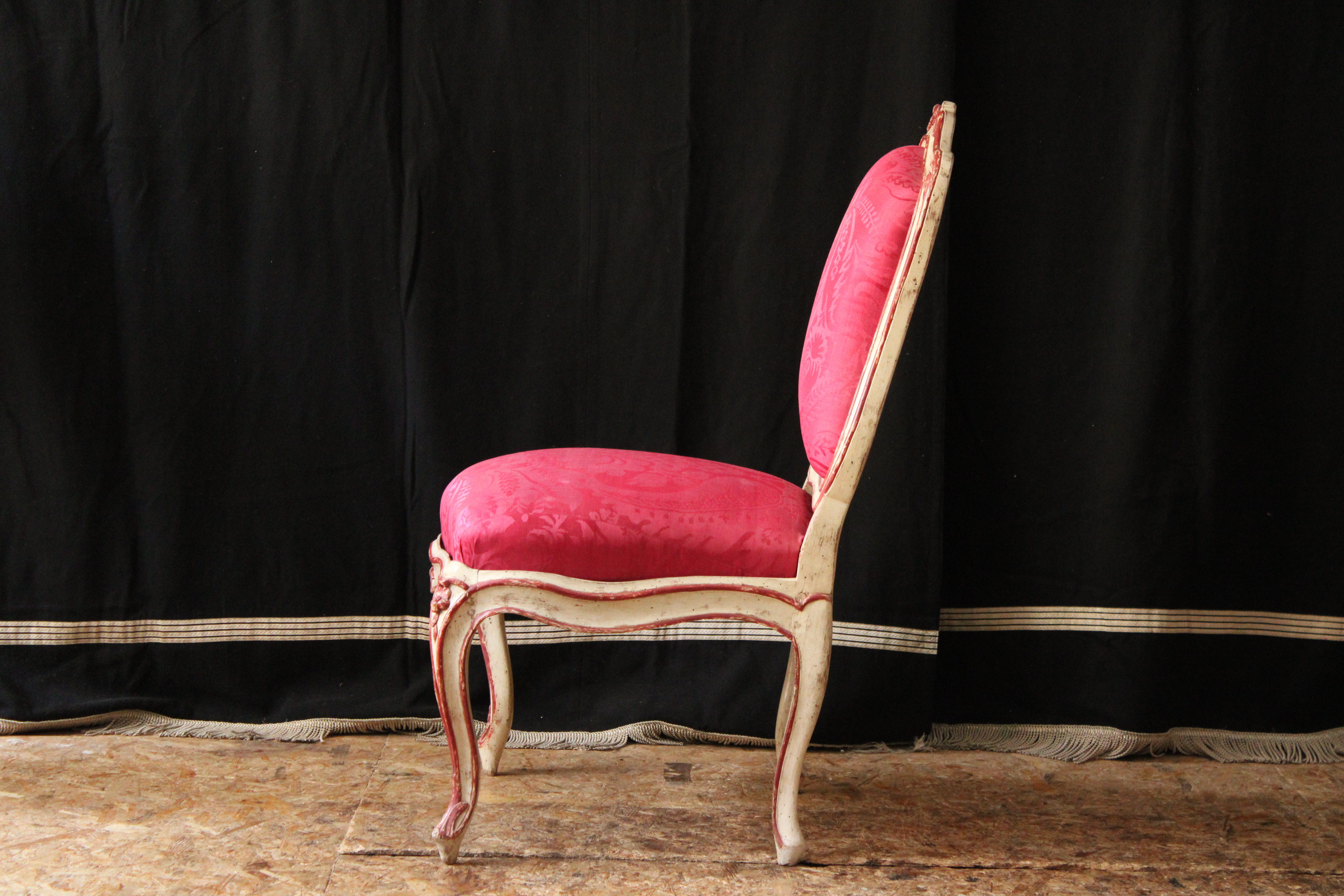 Chaise en hêtre sculpté , mouluré et laqué blanc rechampi rouge, le dossier et l’assise amovibles « à châssis » garnis d’un damas de soie cramoisie. Présentant des lignes discrètes et élégantes, finement sculptée de fleurs au naturel mises en valeur par le rechampi rouge.