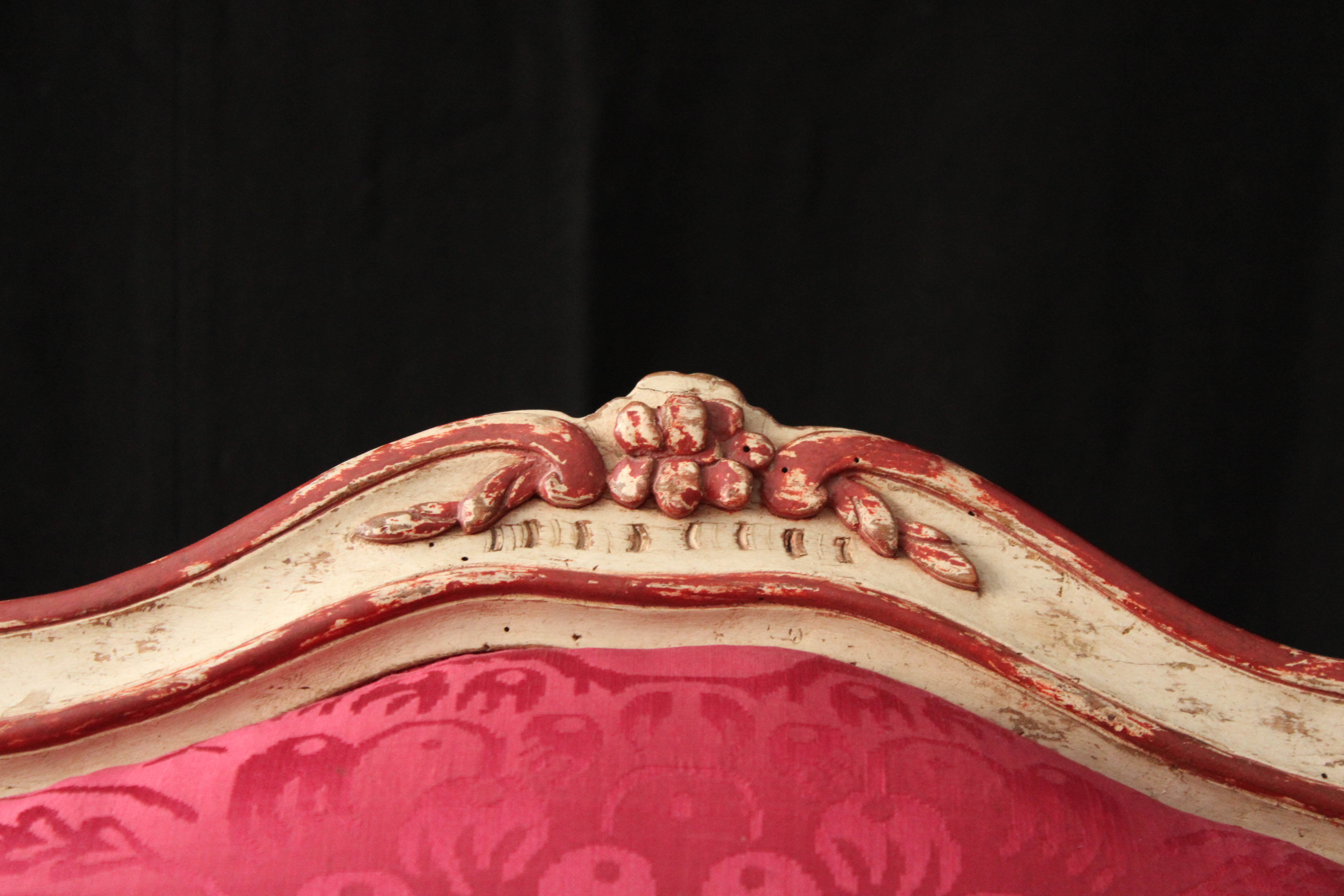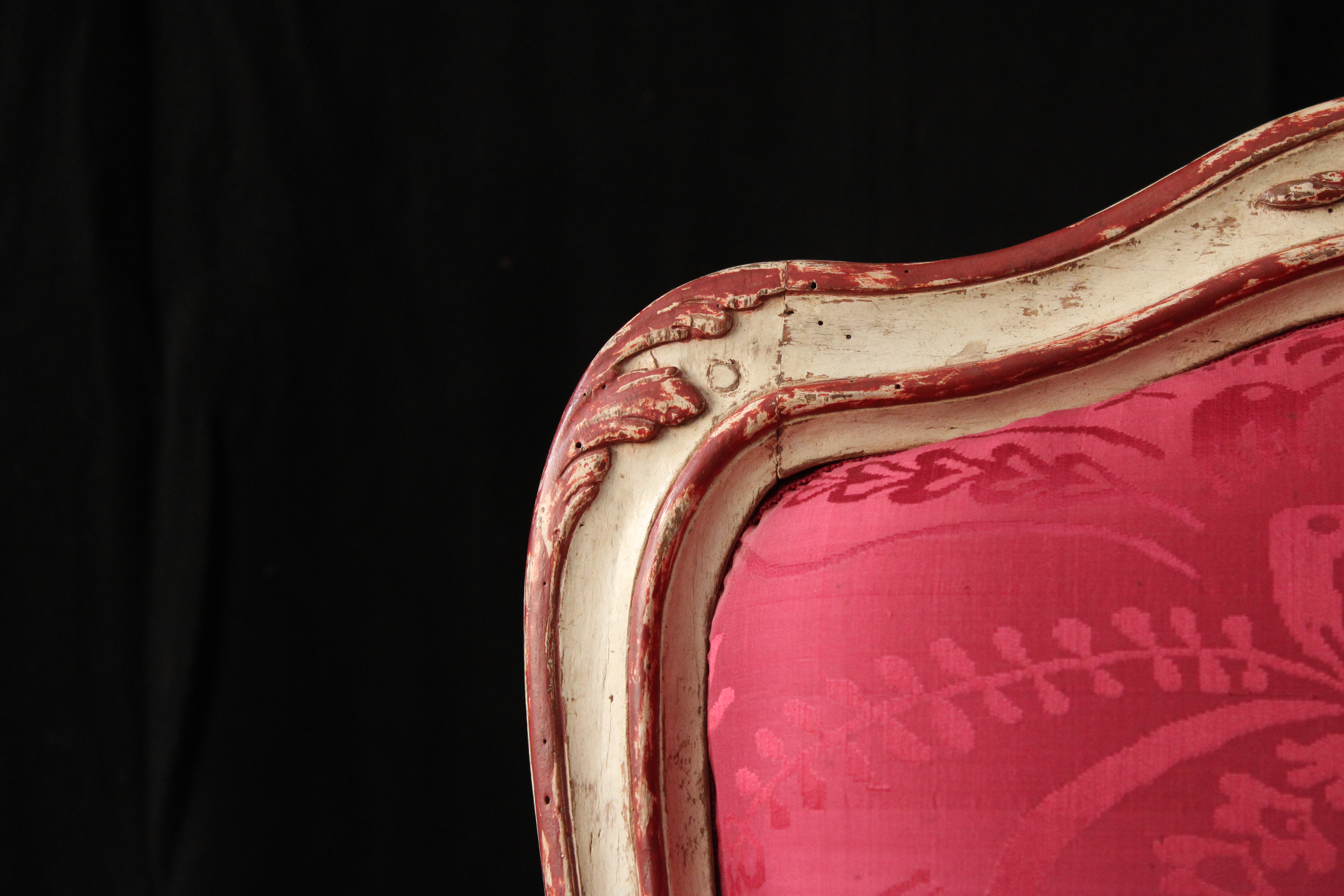 -En très bon état de conservation, une inscription à l’encre est visible sur l’interieur de la traverse arrière. Des traces d’anciennes équerres d’angle sont également visibles. La garniture est en très bon état et le cramoisi du damas se marie parfaitement avec le rechampi rouge.