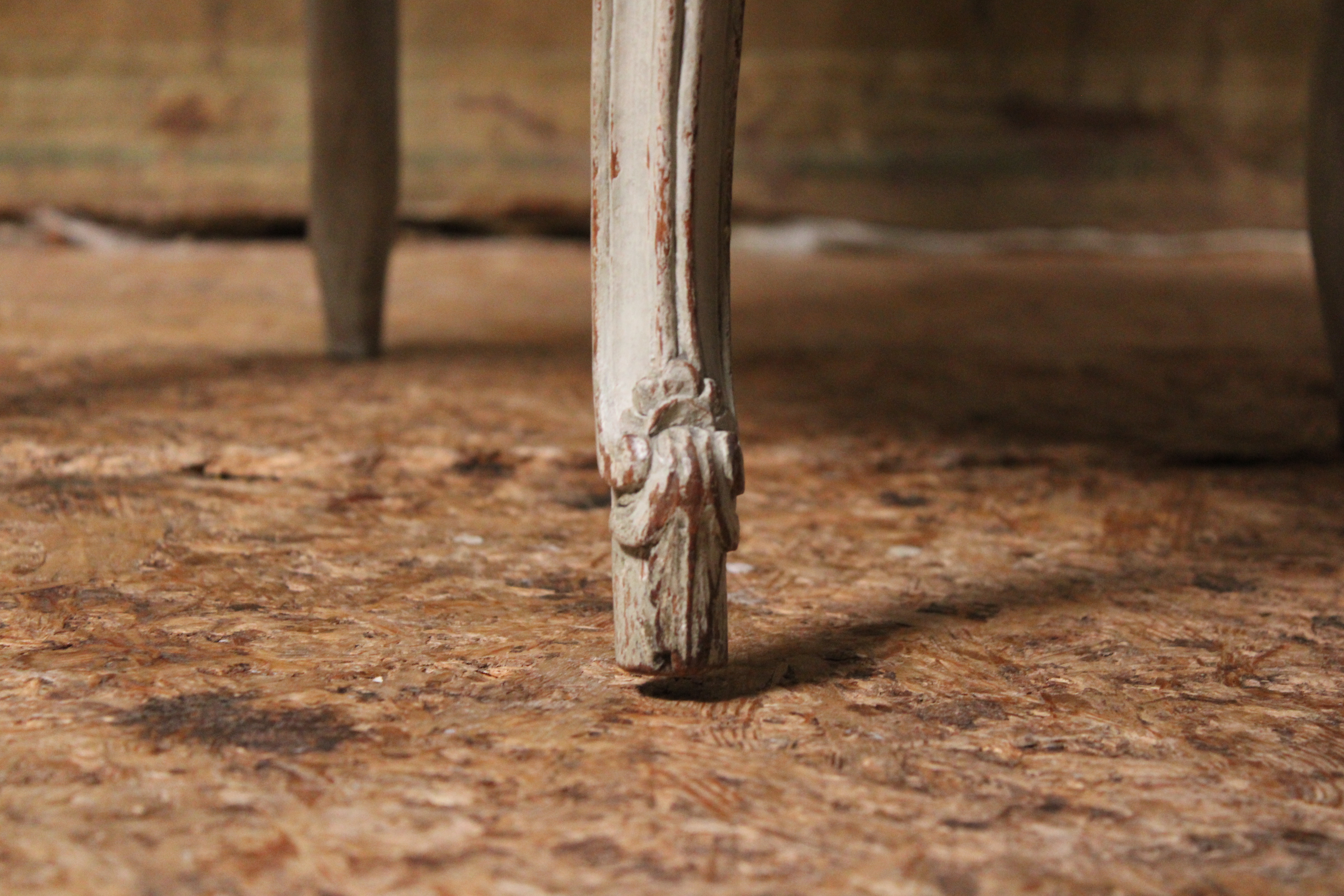 – Ce fauteuil possède quatre pieds galbés moulurés dont les sabots sont recouverts d’une feuille d’acanthe, les pieds antérieurs sont ornés en leur sommet d’un motif rocaille (une palmette plissée en forme d’éventail). La ceinture, chantournée et moulurée, présente en son centre un cartouche rocaille à la forme particulière en forme de cœur caractéristique de la production des Tilliards. Les lignes de la ceinture et des côtés sont soulignées par un enchainement de moulures à volutes formant courbes et contre-courbes. Des lignes courbes rocailles qui ornent également les support d’accotoirs en coup de fouet, et la tête des accotoirs en volutes. Le dossier en médaillon avec mentonnets, traverses et montants moulurés.
