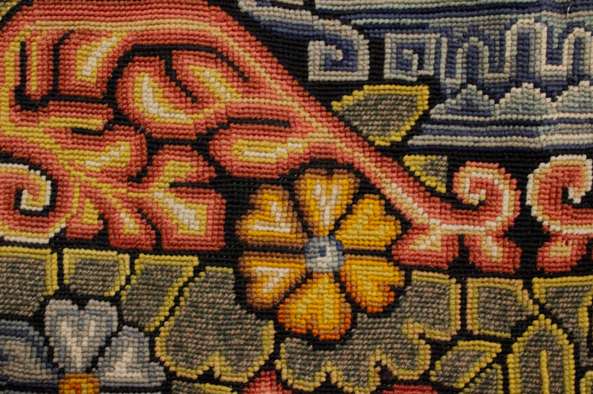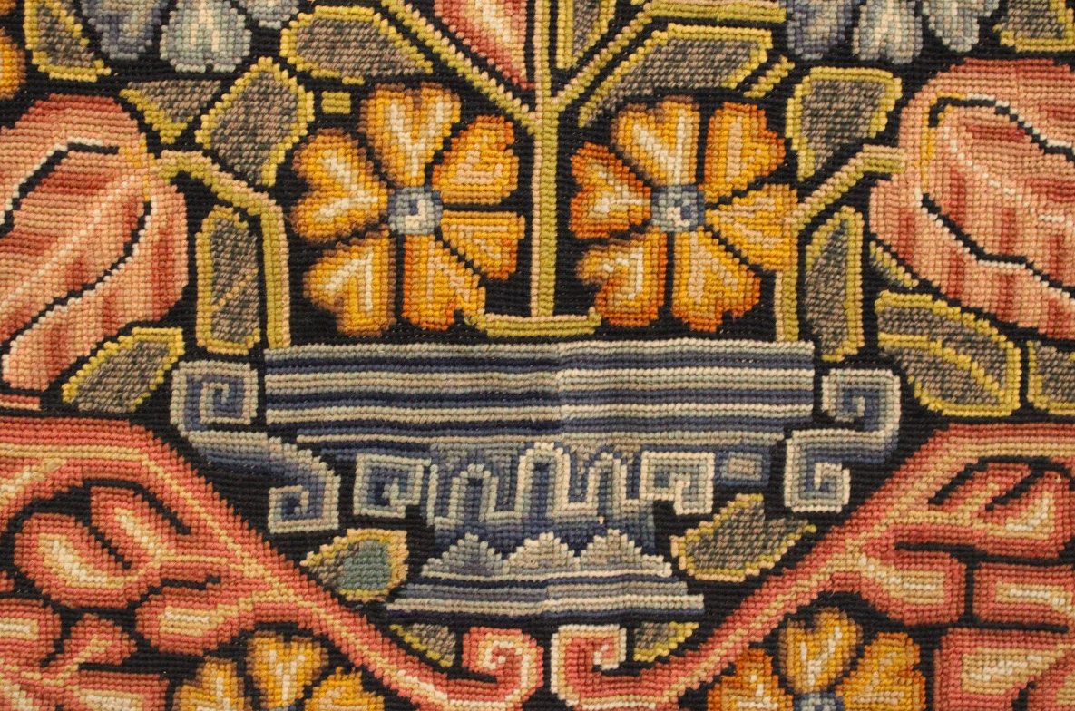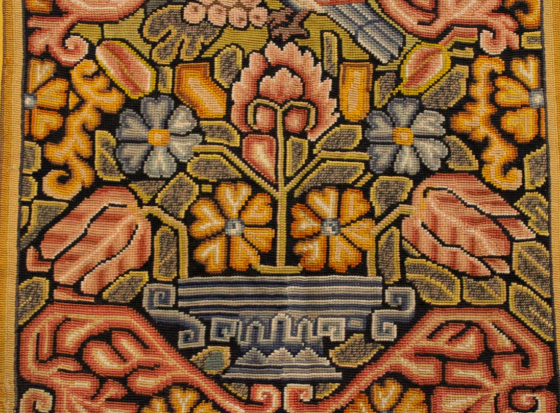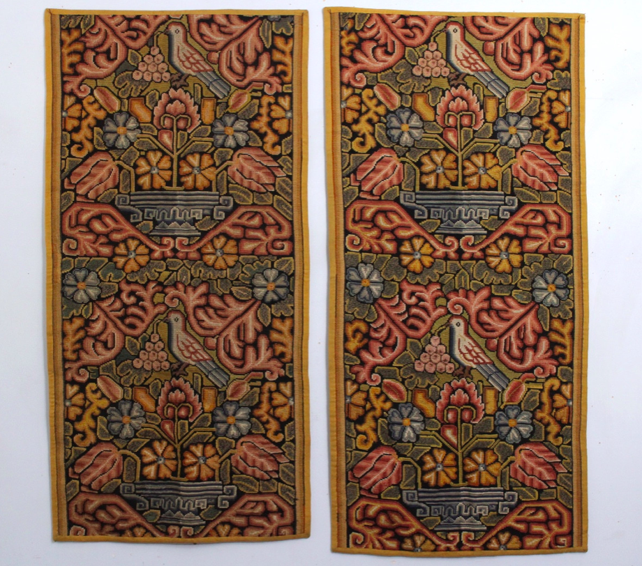 – Ces tissages à l’aiguille nous offre un aimable décor par une effervescence de couleurs et de motifs inspirés de la nature. De nombreux végétaux se déploient et se répètent à l’infini : des tiges fleuries, des rinceaux fleuris, des feuillages et grappes de raisins que des oiseaux viennent picorer. A ceux-ci s’ajoutent des vases antiquisants desquels se dressent les bouquets de fleurs.