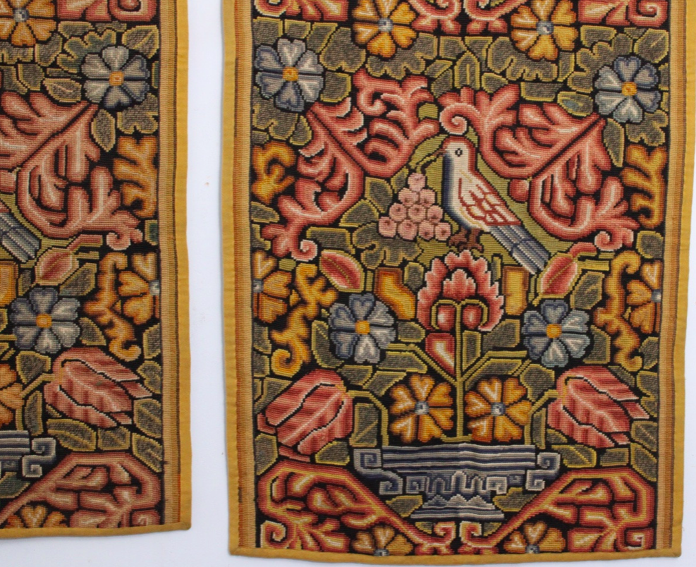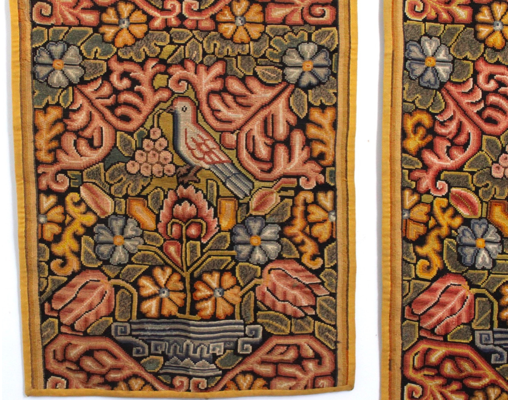 Paire de tapisseries au point, décor végétal habité par des oiseaux, Angleterre début XXe s