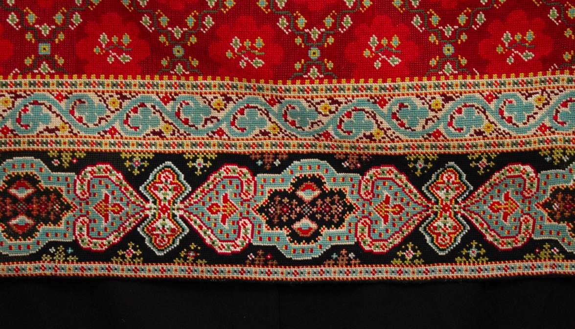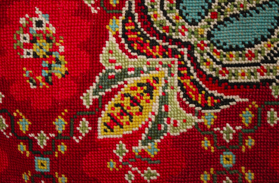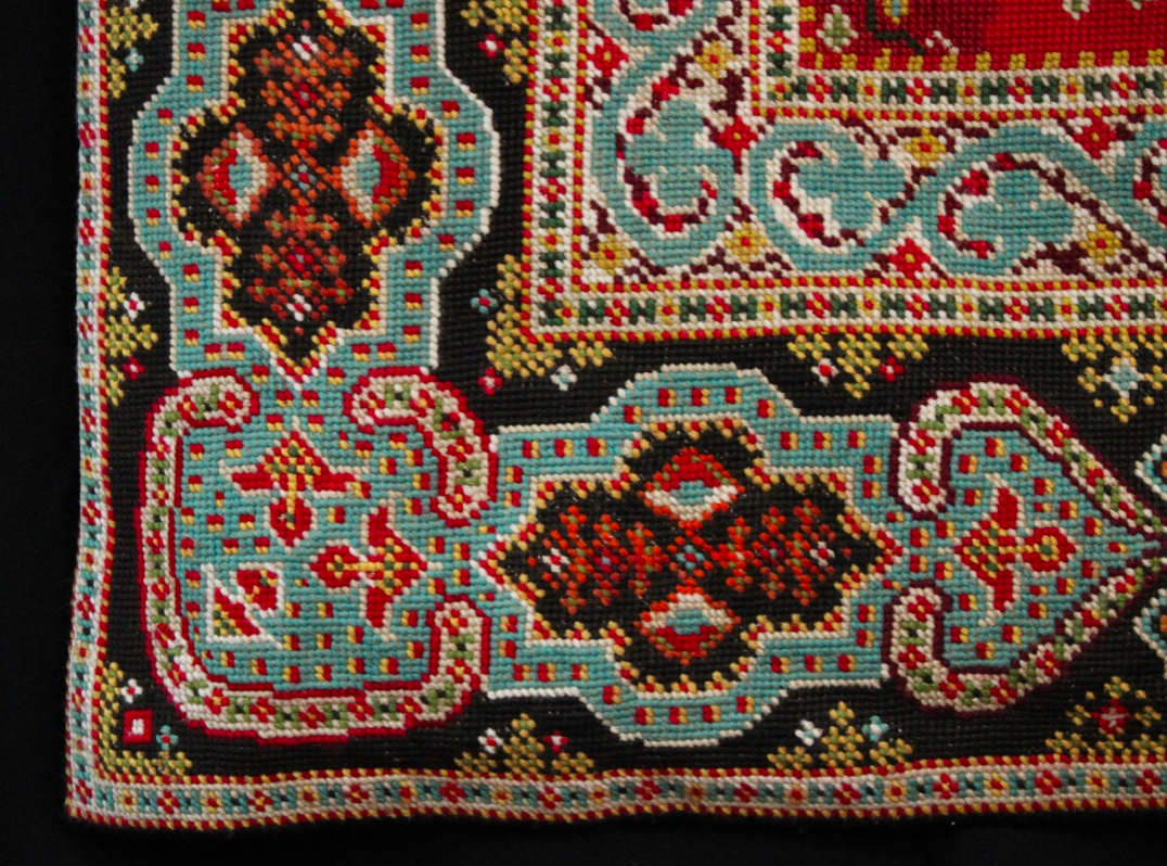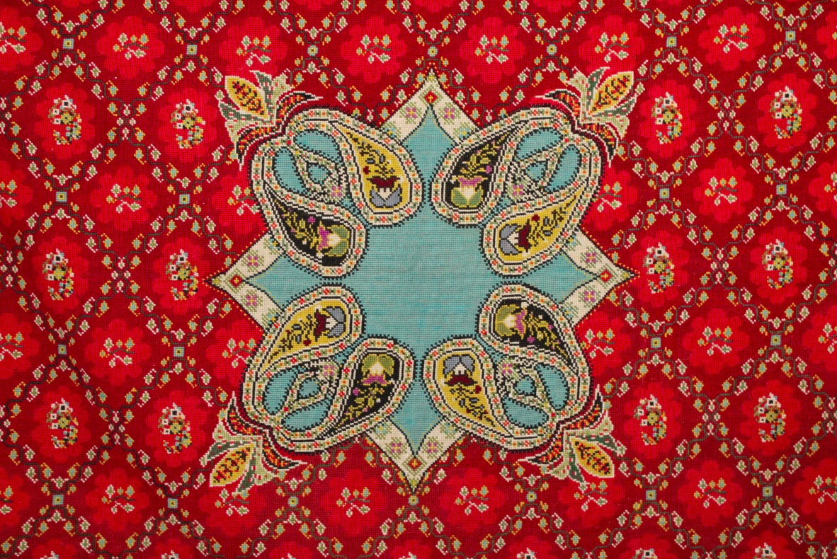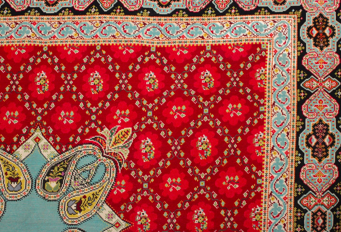 – Ce tissage nous offre un décor remarquable par l’éclectisme de ses motifs et la vivacité de ses couleurs. Si sa composition semble répondre à un agencement commun en Occident avec un médaillon central, un champ à motifs répétitifs, une bordure intérieure et une seconde extérieure, l’observation détaillée de son répertoire ornemental nous renvoie quant à lui vers l’art des tapis orientaux. En effet, l’inspiration persane est palpable dans le traitement élégant et stylisé des motifs, et dans des ornements reconnaissables comme les botehs qui composent le médaillon central ou encore les motifs coufiques sur fond noir de la bordure extérieure.