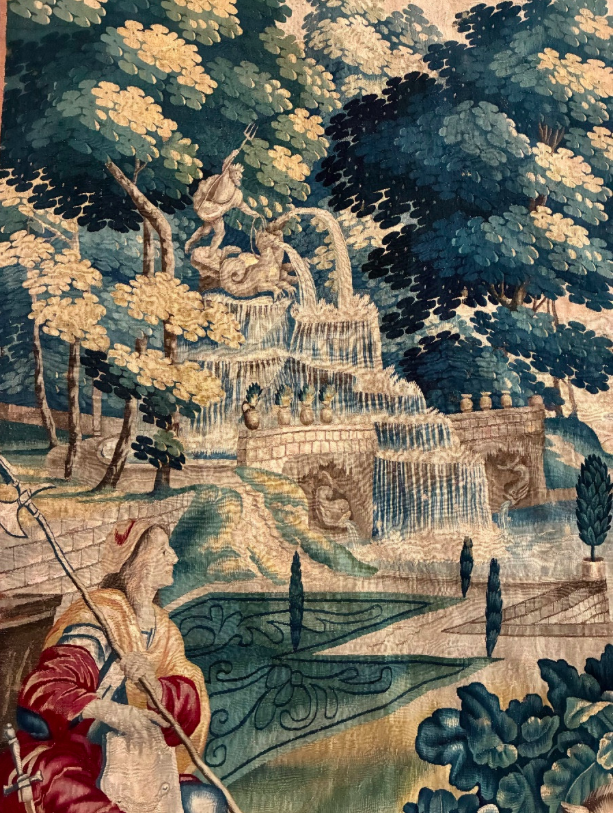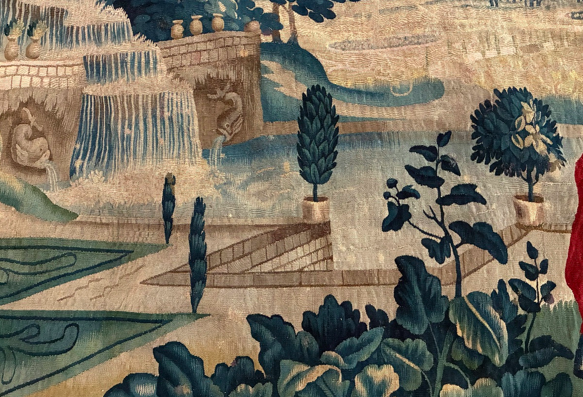 – L’épisode est ici mis en scène dans un formidable décor architecturé et paysagé. La scène se déroule aux abords d’une architecture palatiale majestueuse, le pavement en losange bleu et blanc créant de la profondeur. Le paysage est agrémenté d’une fontaine en cascade et surmontée d’une sculpture en pierre représentant Neptune un trident à la main, tenant les rennes d’un attelage de chimères marines. Un parterre avec des broderies végétales ajoute également au charme de ce paysage qui s’étend au loin. On observe une grande subtilité à l’arrière-plan où les éléments s’estompent progressivement pour donner de la profondeur et créer une perspective.