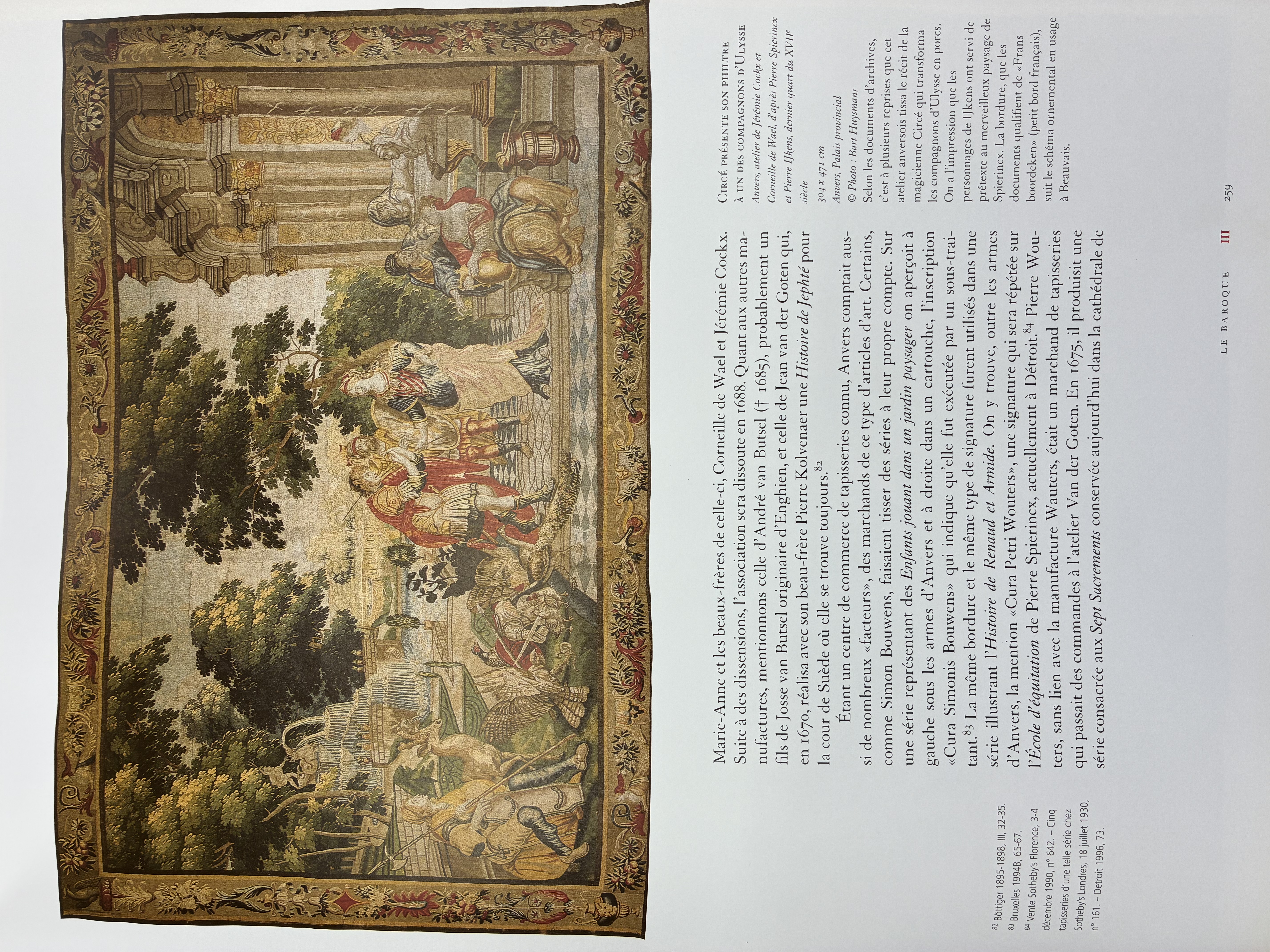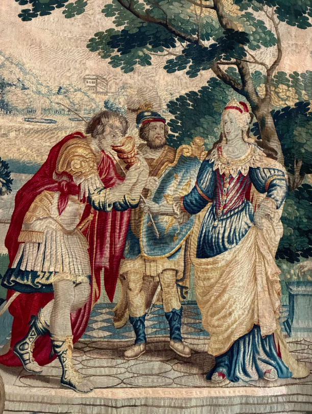 – « Circé présente son philtre à Ulysse », Tapisserie en laine et soie de la tenture de l’Histoire d’Ulysse tissée à Anvers dans l’atelier de Jérémie Cockx et Corneille de Wael entre 1682 et 1688. Le carton qui a servi de modèle au liciers est le fruit d’une collaboration entre deux peintres : Pierre Spierincx (1635-1711) pour le paysage et Pierre Ijkens  (1648-1695) pour les figures.