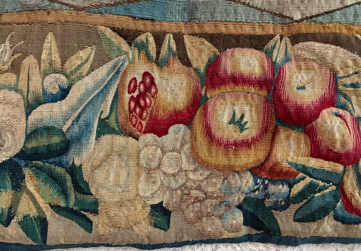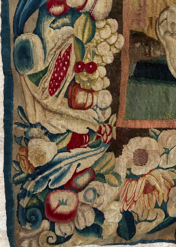 – Très bon état de conservation. D’anciennes restaurations de bonnes factures sont à signaler : rentrayages sur deux verticales, une partie de la bordure supérieure a été retissée ce qui explique la variation de couleurs (cf photos). Tapisserie entièrement doublée, présence d’un système d’accrochages par crochets agrafes.