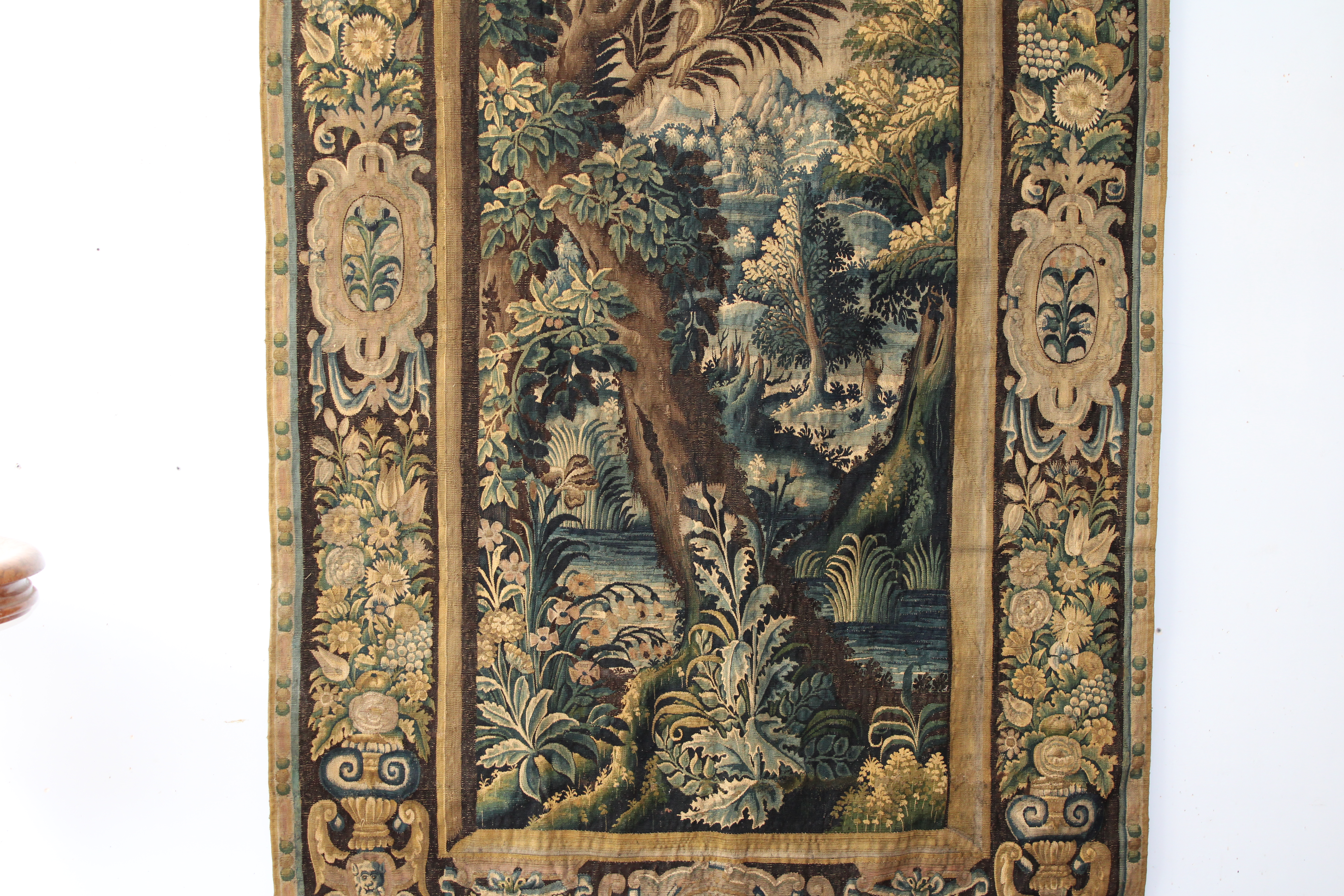 – Cette tapisserie, en laine et en soie, nous offre une véritable fenêtre ouverte sur une verdure de caractère. La végétation exposée, traitée avec réalisme, apparaît avec beaucoup de force et de vitalité ; la forme mouvementée des troncs des arbres creusés par des cavités, l’aspect foisonnant des nombreux feuillages, le pouvoir lumineux de tons clairs juxtaposés en contraste avec des verts foncés et des bruns. L’œil se perd avec délectation dans les nombreux détails tissés ; un cours d’eau, des souches d’arbres, des espèces végétales connues (des chardons, des iris…), deux oiseaux perchés, un arrière-plan avec un clocher et des reliefs montagneux.
