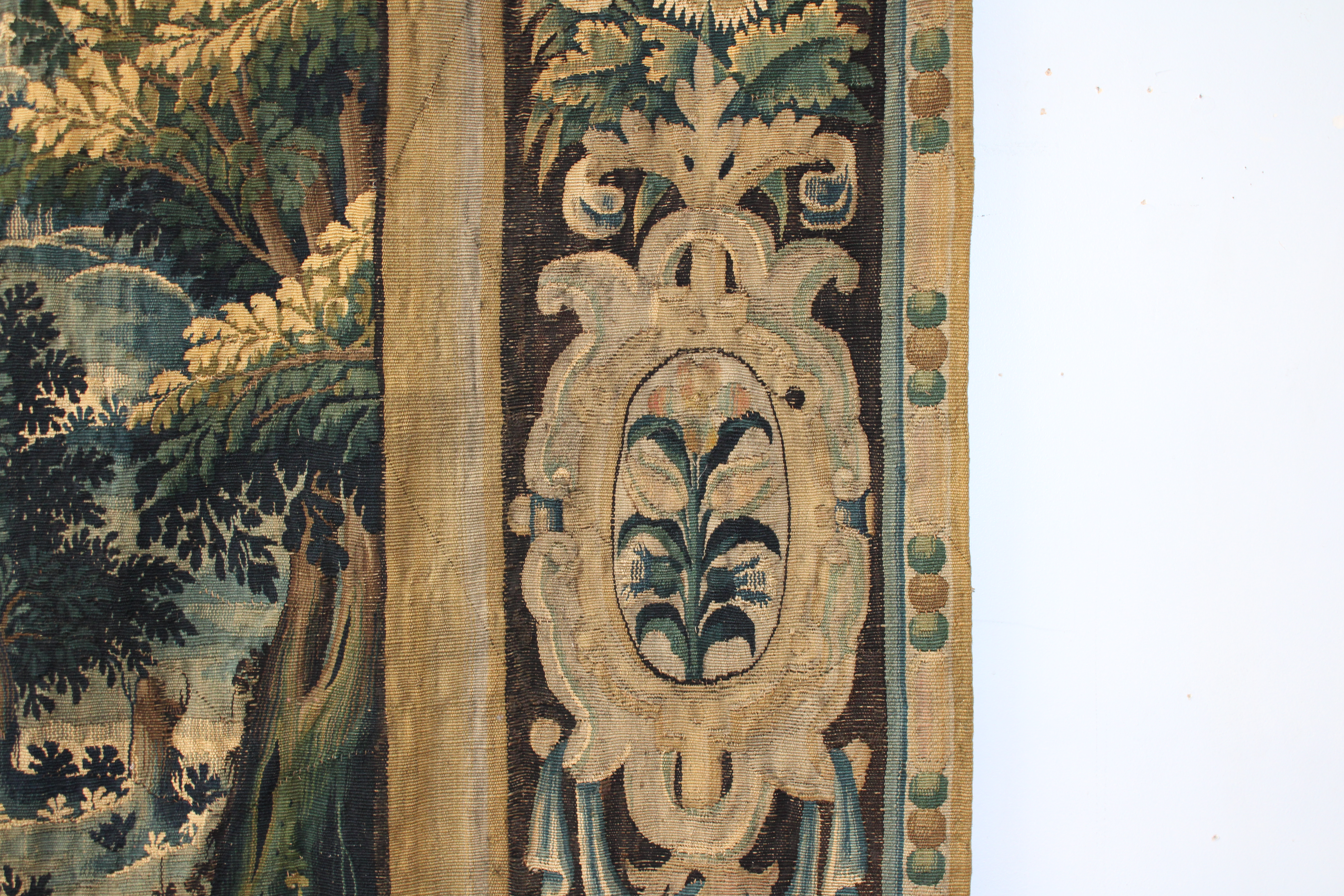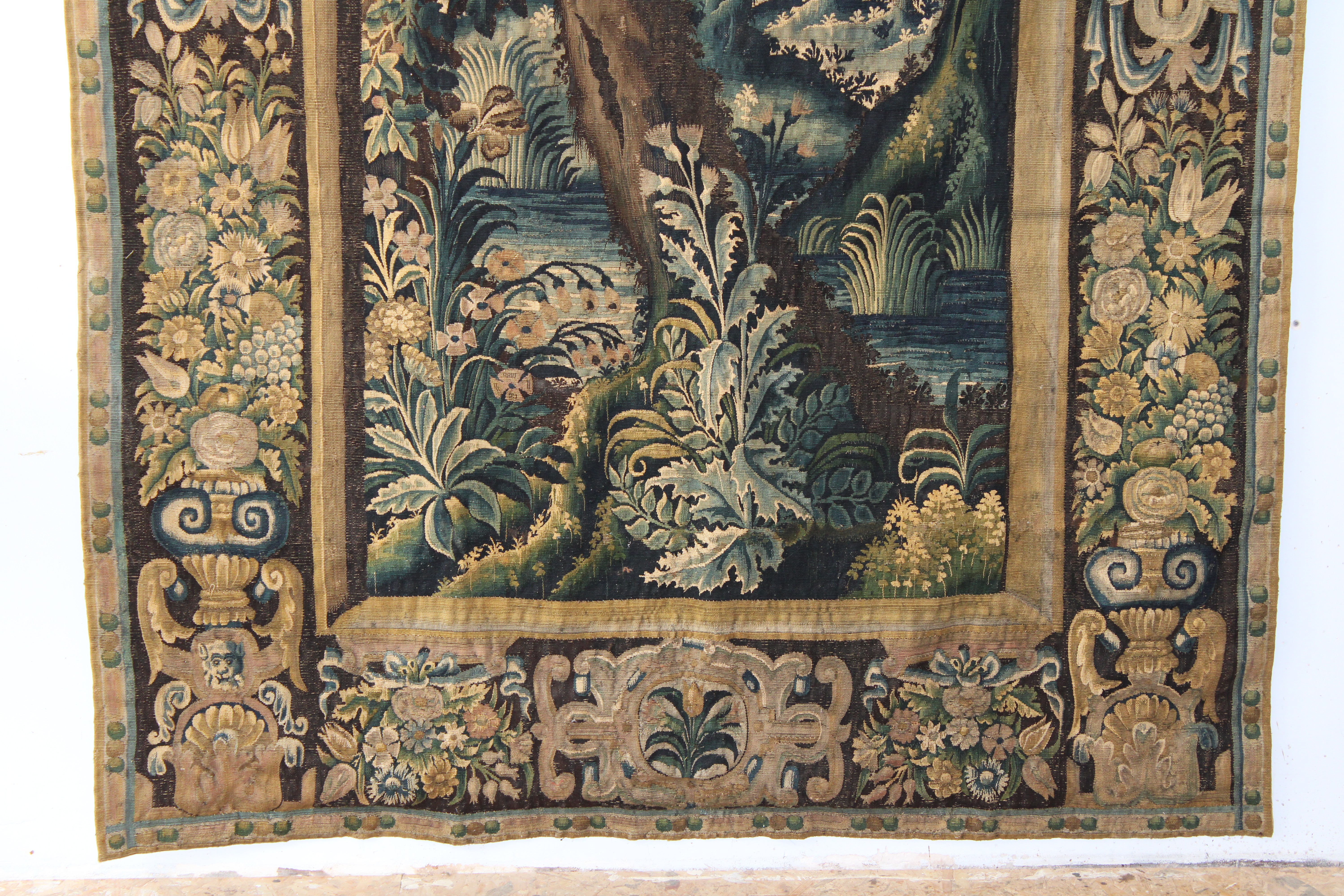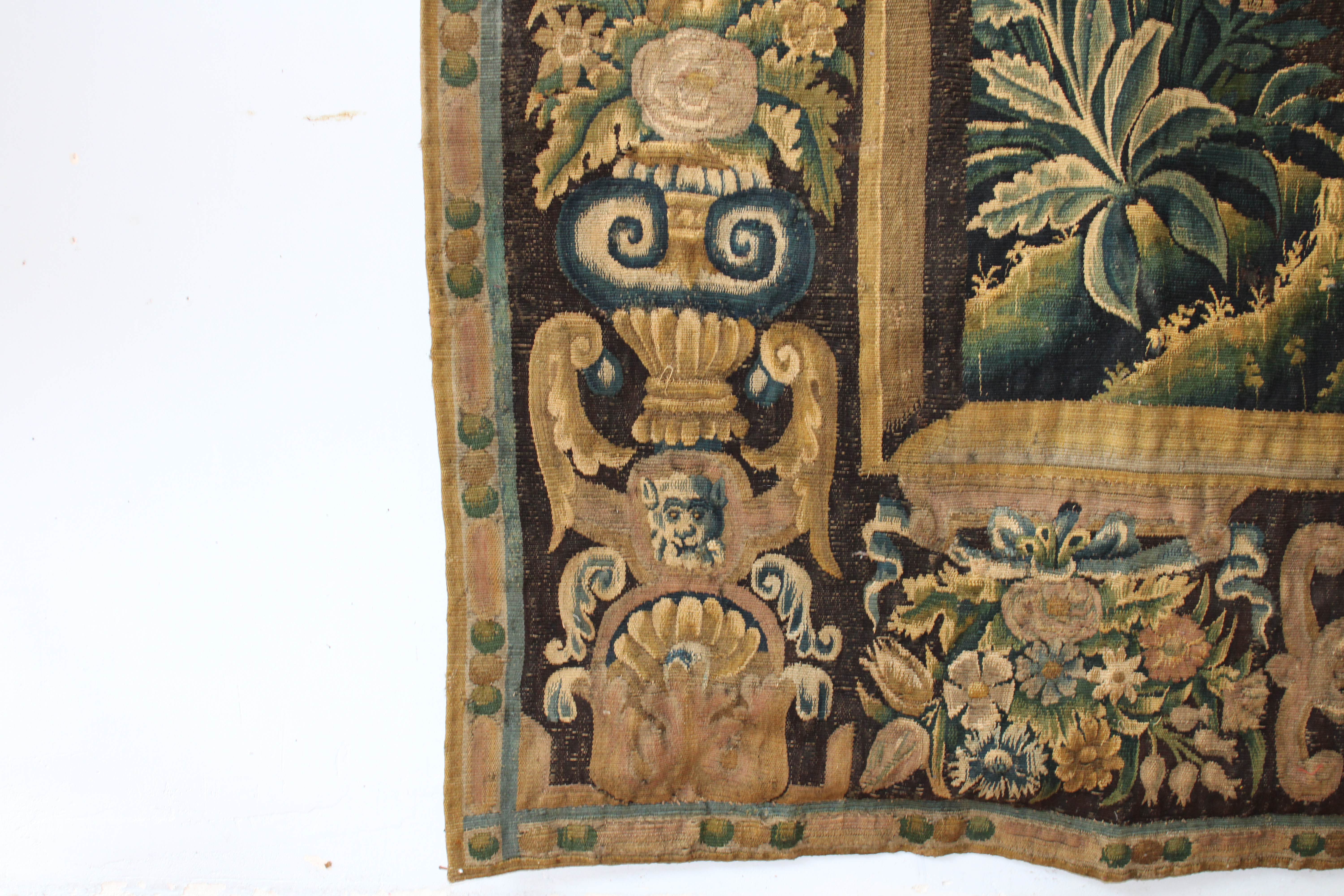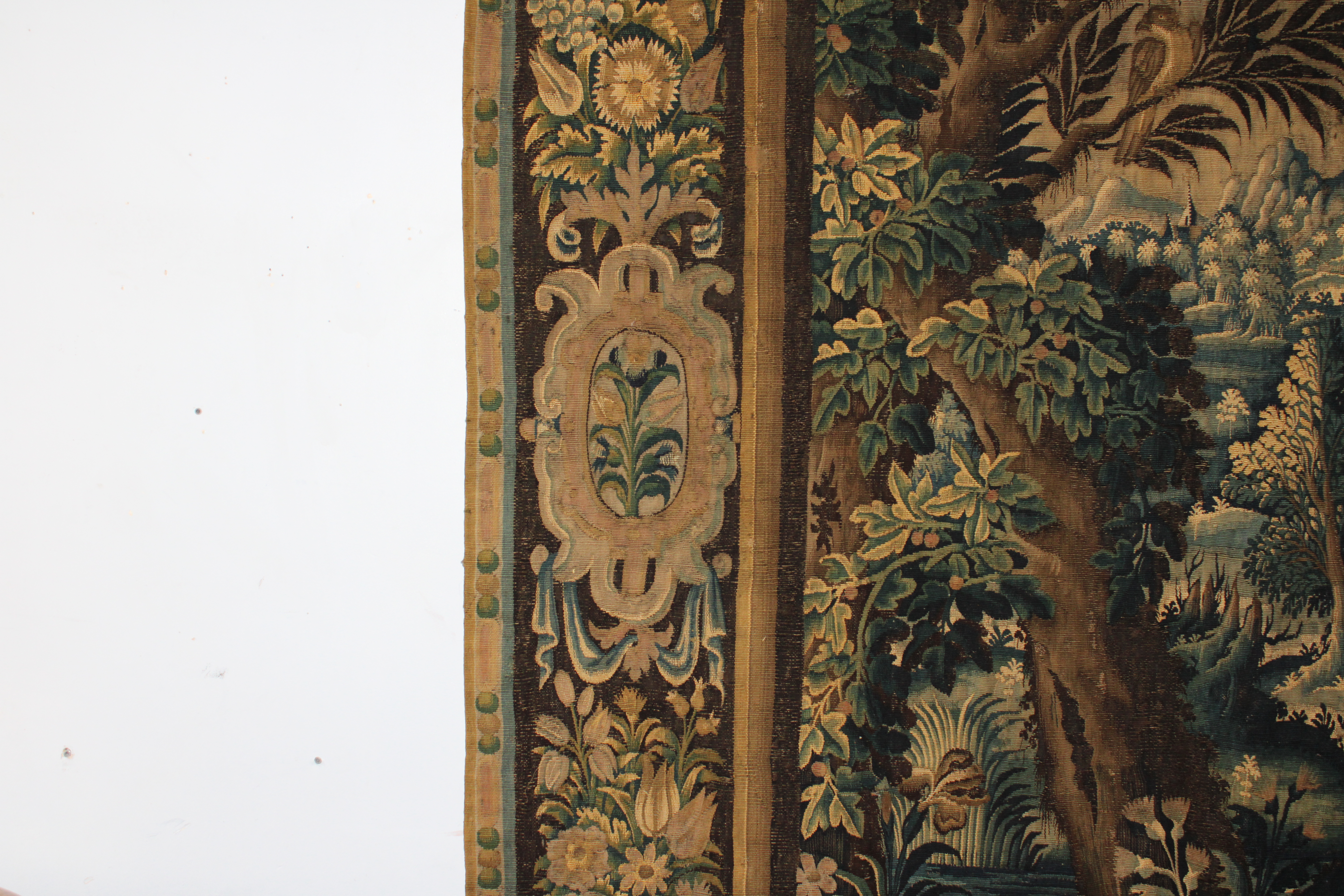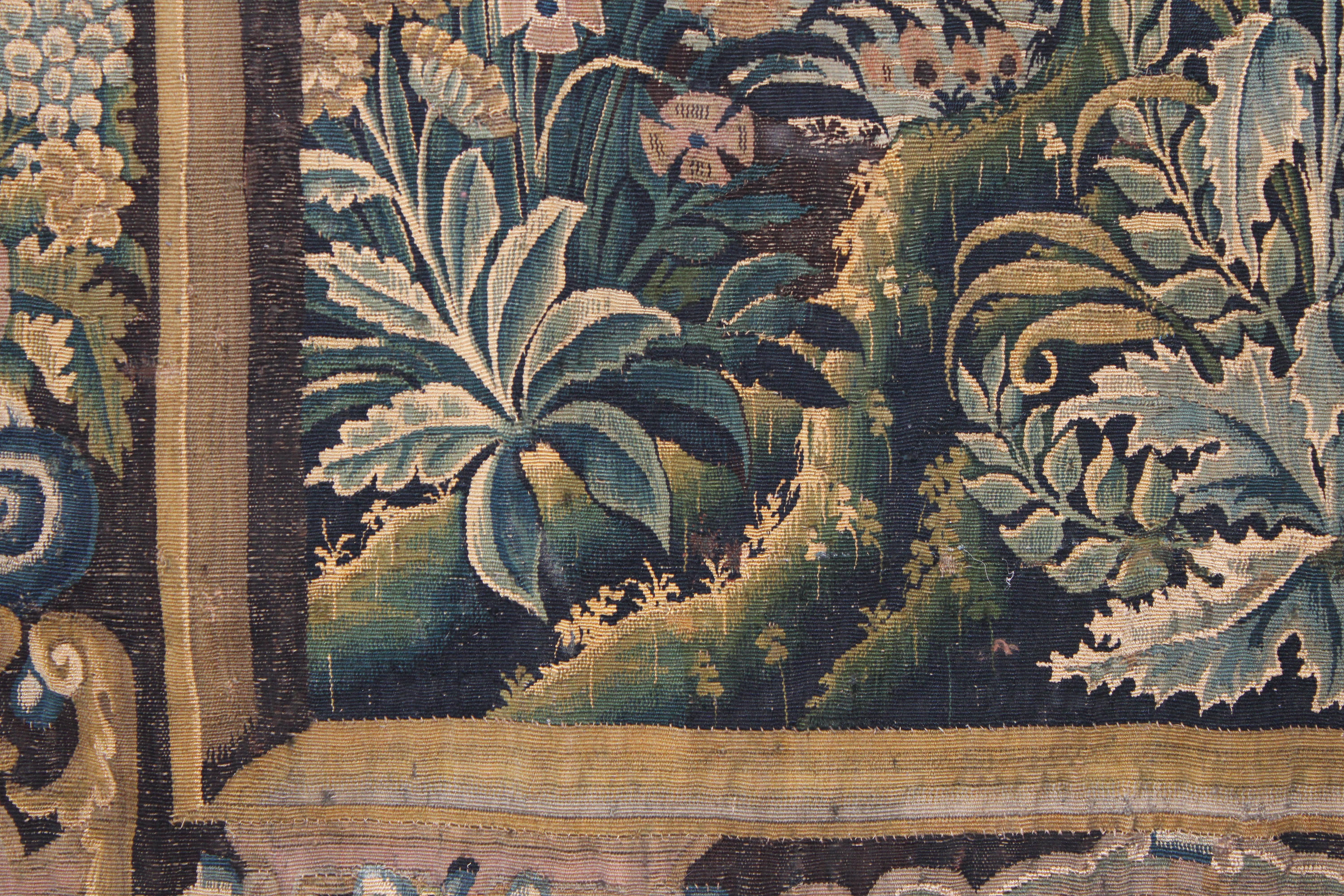 – L’originalité de cette tapisserie réside également dans sa large bordure qui rehausse encore son effet décoratif. Ce type d’encadrement est caractéristique des tissages des XVIIe siècles qui, sous l’influence des Flandres, se dotent d’une bordure prenant de plus en plus d’importance.