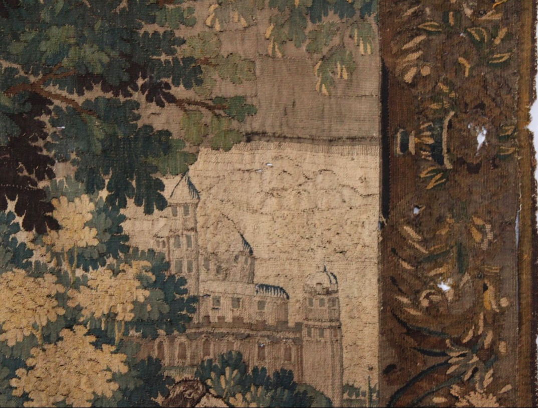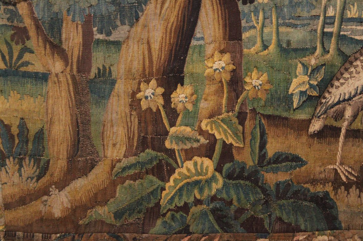 – Le dessin de cette tapisserie est soigné avec une recherche de profondeur grâce à la succession des différents plans. La perception du volume des feuillages a été finement retranscrite par des tons verts clairs juxtaposés à d’autres plus foncés ainsi que par des éclats de lumières introduits par touche, grâce à l’emploi de soie jaune doré, aux extrémités des feuilles. Ces touches de lumière permettent également de guider le sens de lecture ; ses rayons de soleil s’introduisent dans la verdure depuis la gauche.